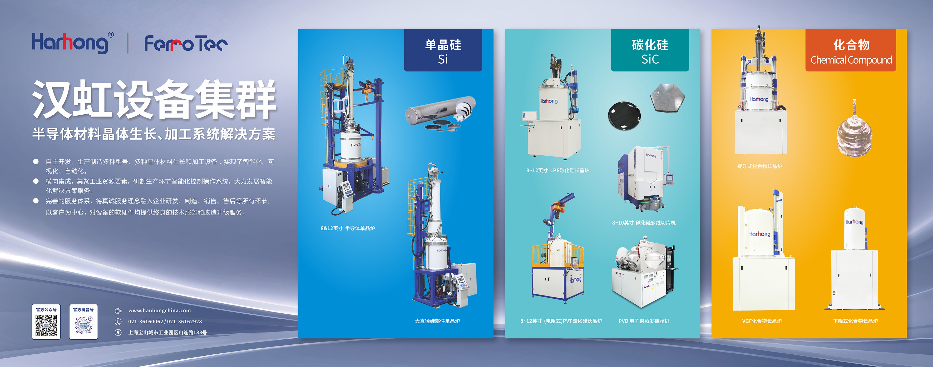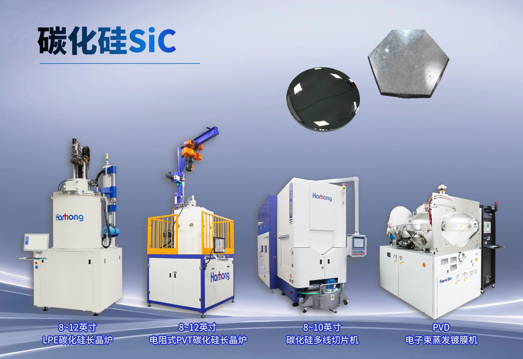 8~12英寸LPE碳化硅長晶爐、8~12英寸電阻式PVT碳化硅長晶爐、8~10英寸碳化硅多線切片機、PVD電子束蒸發(fā)鍍膜機